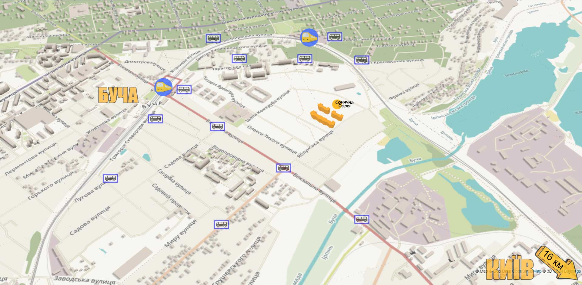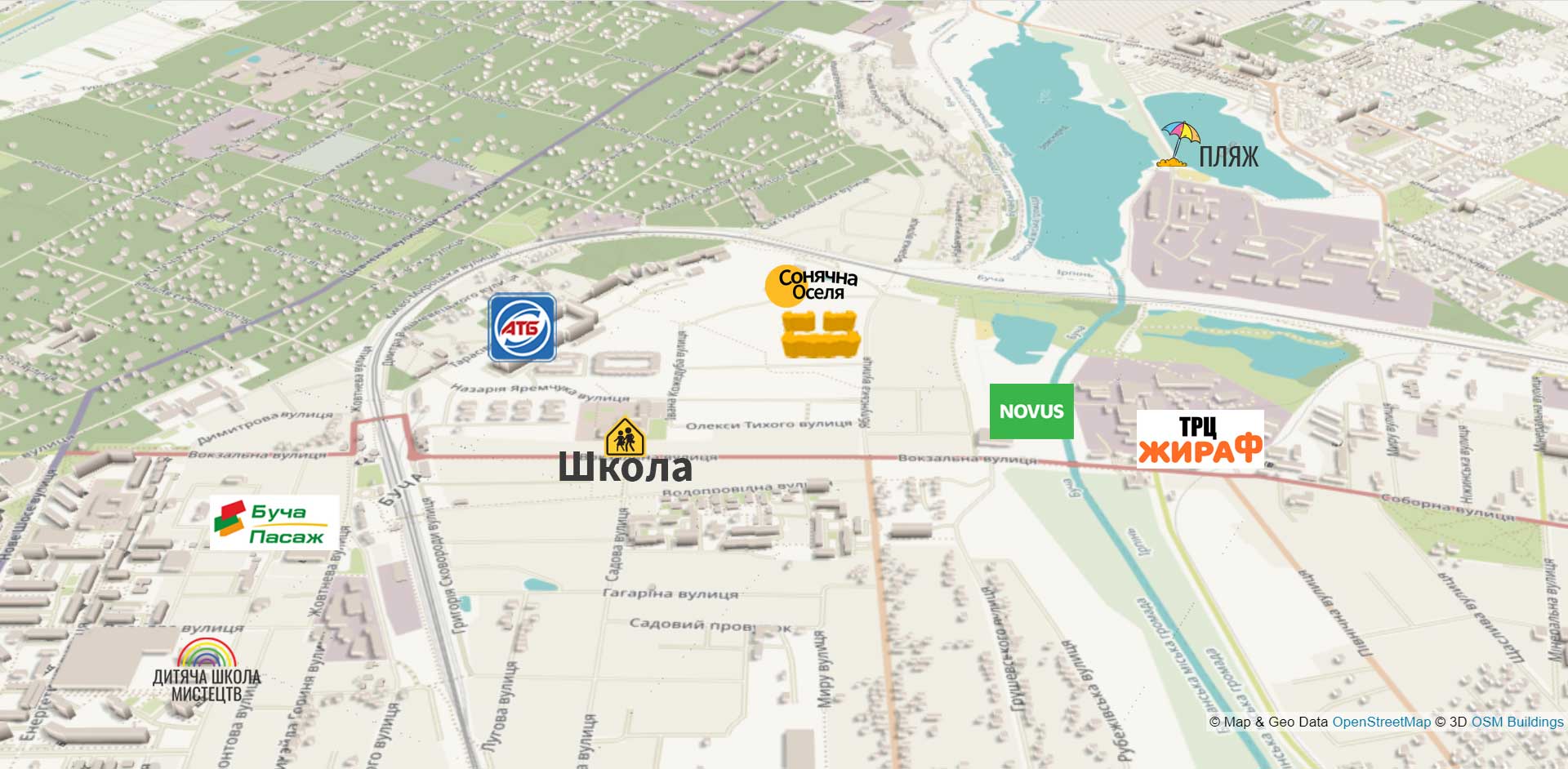 Житловий Квартал «Сонячна оселя» має гарне географічне розташування, між двома містами – Буча та Ірпінь. Комплекс знаходиться не далеко від зупинки електрички, але і не зовсім поруч, що дуже комфортно. В межах 5-10 хвилин розташовані автобусні зупинки маршрутів: